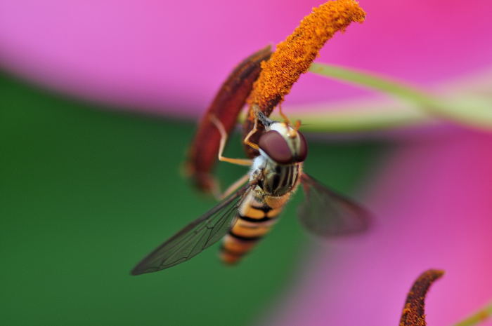 marygold,deine Skorpionsfliege ist ein Weibachen. Auch deine Hainschwebfliege ist weiblich.Bergfeige,Zum Thema Makrofotos von Insekten gibt es diverse Bücher und Internetseiten.Meine Erfahrungen sind folgende:Die besten Makrofotos gelingen morgens oder am späten Nachmittag. Dabei wird kein Blitz verwendet, um Reflektionen zu vermeiden. Ein Stativ ist förderlich, wenn nicht sogar zwingend, da längere Belichtungszeiten verwendet werden.Ich selbst gehöre nicht zu dieser Gruppe von Fotografen, zumal ich keinen Schönheitswettbewerb gewinnen will. Ich sammle per Foto Insektenarten und dokumentiere eine bestimmte Art. Mein Schwerpunkt sind dabei Grab- und Wegwespen. Nesteintrag für die späteren Larven findet aber in der Mittagszeit statt. Hier herrscht grelles Sonnenlicht. Das heißt ein Blitzlicht ist Pflicht, um die harten Schatten auszuleuchten. Ring- oder Zangenblitz ist hierbei von Vorteil. Um Bewegungsunschärfe zu vermeiden empfehle ich den Blitz auf 1/200 sec. einzustellen, Blende 8 bei Bewölkung, Blende 11 bei blauen Himmel.Als Objektiv 100mm von Canon oder 150mm von Sigma. Ein Stativ ist zum dokumentieren nicht erforderlich, eher hinderlich, da man innerhalb von Sekunden reagieren muß, um eine bestimmte Art, die man vielleicht nie wiedersieht, zu erwischen.Bei deiner Canon 400 D kannst du über die Individualeinstellungen den Blitz „fest aus 1/200 sec.“ einstellen. Modus: AV. Auch die genannten Objektive sind optimal für diese DSLR.Hoffe, du kannst mit diesen groben Hinweisen was anfangen.
