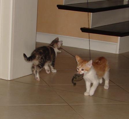 noch ein foto:der rote, das katerchen, timmy, liebt es, seine beute zu tragen! er schleppte die maus mitsamt der schnur, so weit wies nur möglich war.