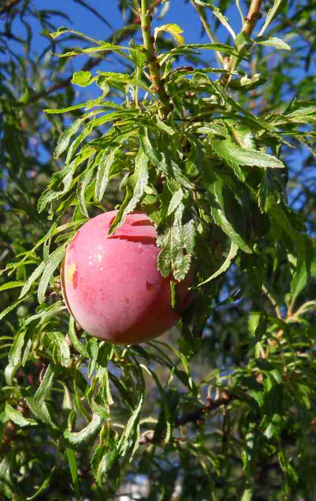 Ich habe diesen Prunus aus Samen gezogen, die Blätter sind sehr schmal und heuer hat er das erste Mal gefruchtet. Die Frucht ist ähnlich einer Kirschpflaume, ca 3 cm im Durchmesser.