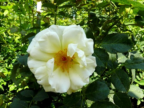 Jetzt blüht sie. Und ich bin doch etwas enttäuscht. Ein ganz kleines (d ca 2 cm), einfaches Rosenblütchen ... (Es hat wohl sehr viel für sich, gezielt zu kreuzen ...