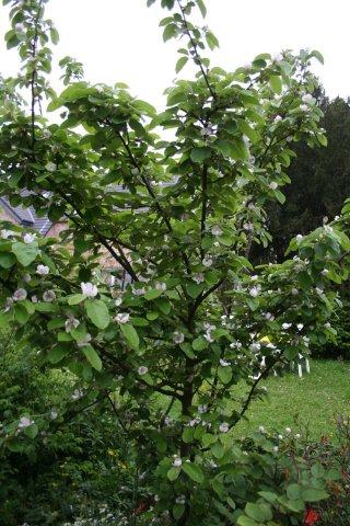 Meine Apfelquitte(Konstantinopeler) steht jetzt in voller Blüte, die Portugisische Birnenquitte ist schon verblüht. Auffällig ist das dieses Jahr erschreckend wenig (Wild-)Bienen unterwegs sind.