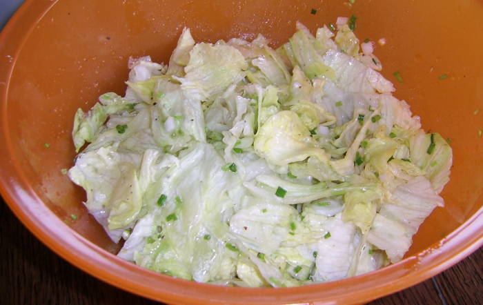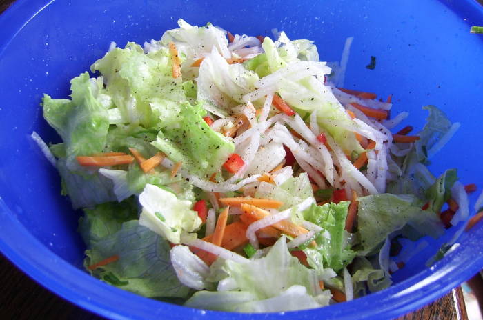 Auch mit Salat, der Abwechslung halber aber mit oranger Schüssel