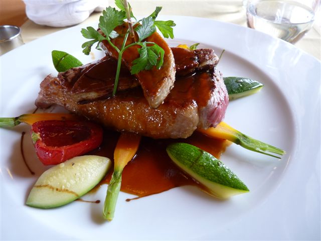 ... danach ein irisches Rinder-Entrecôte mit Entenleber an einem Rosmarinjus, Gemüse und einer Folienkartoffel (nicht auf dem Bild).