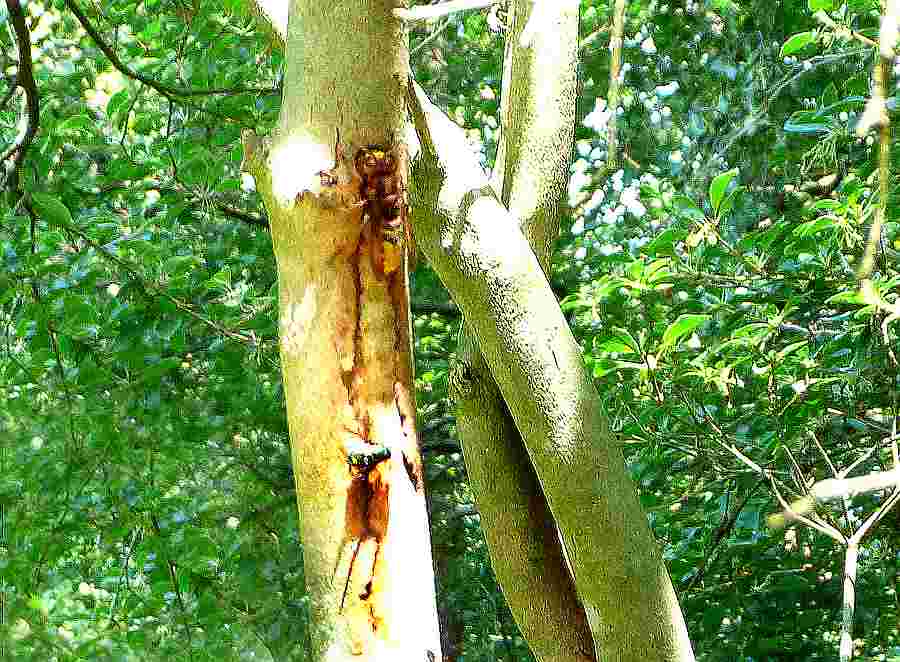 Hornissen haben mittlerweile den Status eines Kulttieres. Die "friedlichen Riesen" werden hymnisch besungen, vor allem was ihre Nützhlichkeit betrifft.Da habe ich andere Erfahrungen. Von den Nashi-Birnen ernten wir nichts. Sie beißen ein Loch in die Schale und fressen das gesamte Fruchtfleisch bis auf das Kerngehäuse auf. Wenn man sich der Szene nähert, wird man gefährlich brummend umschwirrt und zieht sich vorsichtig zurück. Auch nachts sind Hornissen unvermindert aktiv.Nun haben sie neuerdings einen 30-jährigen Enkianthus campanulatus aufs Korn genommen und weiden genüsslich dessen Rinde einschließlich des Kambiuns ab. Ob der 3-4 m hohe, prachtvolle Strauch das überlebt?Anbei ein (fotografisch nicht sonderlich gutes) Bild. Dort, wo die Hornissen die Rinde abgeweidet haben, stellen sich Fliegen ein, um etwas dem Saft zu naschen.