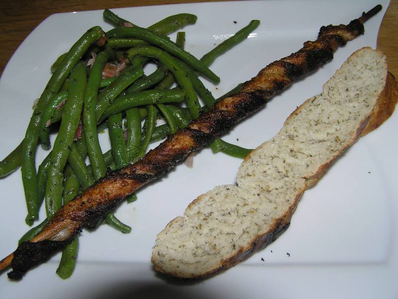 bei uns gabs gestern reste, bevor wir einkaufen gegangen sind.grillfackeln schnell gegrillt, dazu speckbohnen und ein rest vom selbst gebackenen kräuterfocaccia.