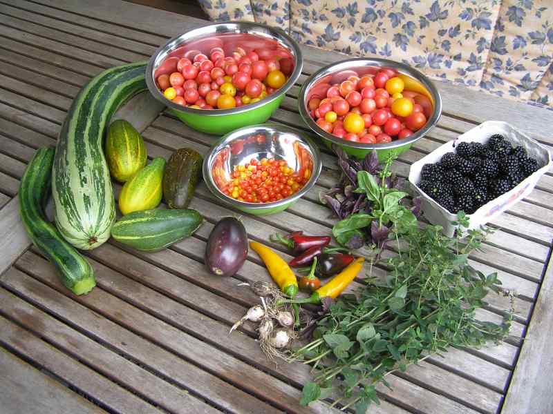 bis auf die zucchini, brombeeren, kräuter und knoblauch alles vom balkon