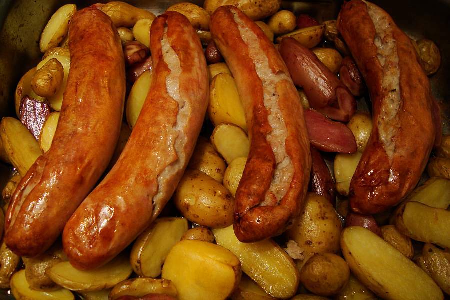 bei uns gab es die ersten eigenen kartoffeln - mit thüringer bratwurst aus dem backofen.