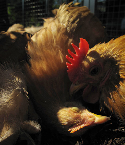 Hier noch ein Gute-Nacht-Bild für Tara.Man beachte in der Schmuserunde den verdrehten Kopf des Hühnchens und den verklärten Blick von Fisalis.