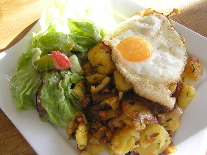 und heute gabs seit ewigkeiten mal wieder ganz klassische bratkartoffeln aus pellkartoffeln mit speck, zwiebeln und schnittlauch. dazu spiegelei und ein bunter salat