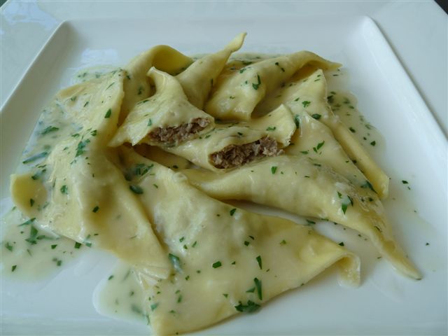 Ravioli mit einer Füllung vom Kalbschwanz an einer Weisswein-Meerrettichsauce