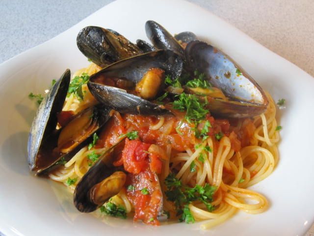 Bei uns gabs heute Spaghetti mit Tomatensoße und Muscheln