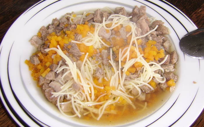 Nachtrag vom Freitag:Nudelsuppe mit Fleischeinlage und kleinen Karottenwürfeln.