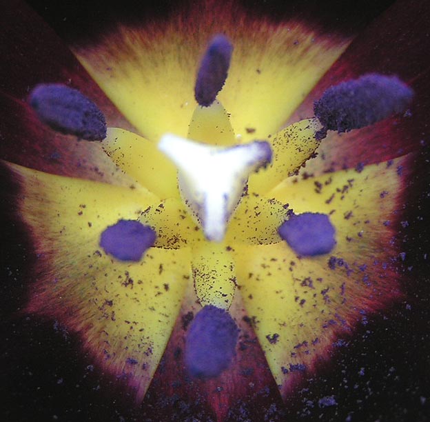 Hab ich noch nie so gesehen.Sowieso fallen mir erst jetzt (mit Makrokamera) die Feinheiten des tulipanischen Innenlebens auf.Lila Blütenstaub.