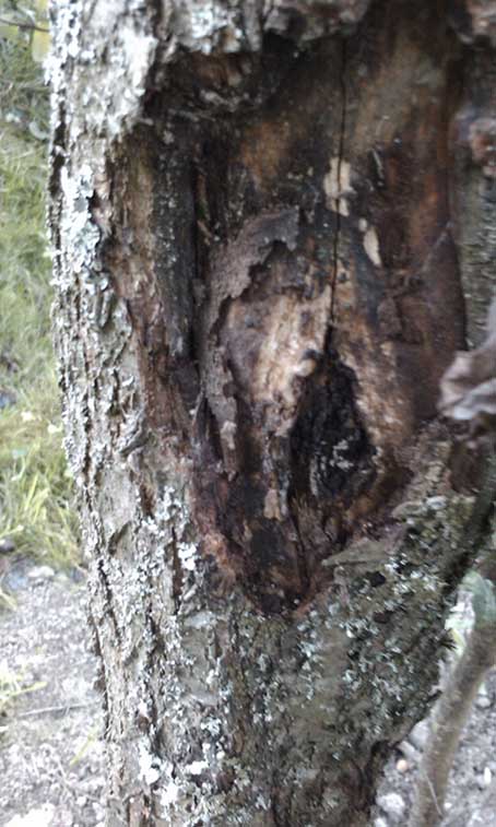 Falls ich heute noch bei Tageslicht nach Hause komme, werde ich mal Bilder der maroden Kraxen machen. Edit:Habs geschafft :)Hier das erste, eine der Stammverletzungen der Eberesche: