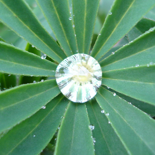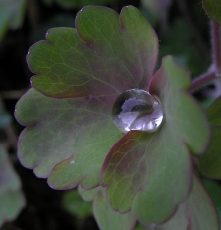 Wenn man Tropfen nah genug im Fokus hat, dann fragt man sich, wo man scharf stellen soll.Hier liegt die Schärfe am Tropfengrund, man sieht die Blattstrukturen, auf denen der Tropfen hängt ... und durch die er teilweise aufgenommen wird.