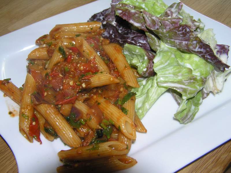 und heute penne all’arrabiata mit eigenen auberginen mit drin. dazu roter kopfsalat.
