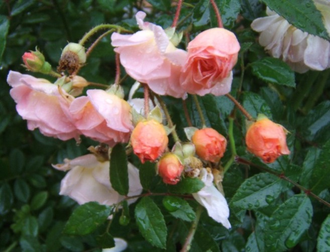 Auch Ghislaine mit hängenden Köpfen im Regen, in herbstlichem kräftigem rosa-apricot. (Ich glaube, sie hätte gute Chancen auf einen Preis für die meistfotografierte Rose