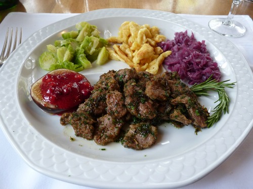 ich war unterwegs ;)Erst gab es:Gänseleber-Pastete mit Walnüssen und Entenleber-Terrinedanach das erste Reh der Saison, als Geschnetzeltes mit köstlichen Beilagen.