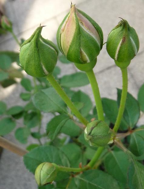 Knospen um diese Zeit! Ich bin der Besitzerin dankbar, daß sie das Töpfchen immer im richtigen Maße gegossen hat und die Rose auch rechtzeitig umgepflanzt hat. Was will man mehr. (außer natürlich, daß ich die Blüten gerne auch noch gesehen hätte, die erste, bevor ich sie verschenkt hatte, war schon sehr vielversprechend!)