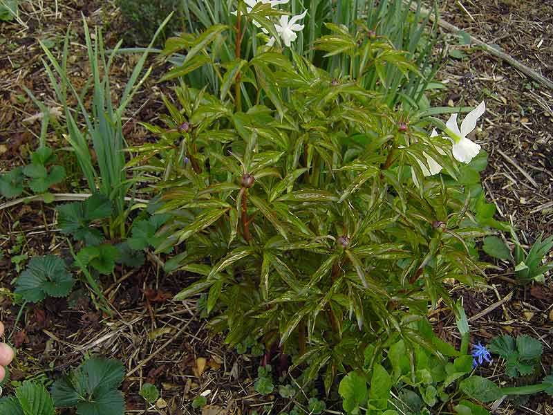 Diese Staudenpäonie wurde im letzten Herbst umgepflanzt. Dabei mußte ich eine fingerdicke Wurzel durchtrennen. Bisher bin ich ganz zufrieden. Ich glaube, sie blüht weiß gefüllt.