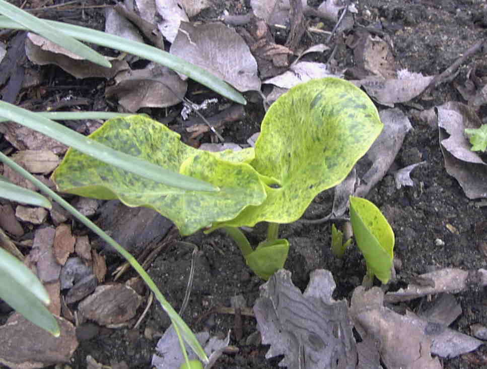 Weils so schrecklich ist gleich noch einer: Arum italicum 'Miss Janay Hall'. Sieht aus wie mit einer Sprühpistole rübergegangen.Ich find, das teil sieht einfach nur schrecklich ausFür alle die panaschierte Pflanzen ablehnen ist Arum maculatum 'Painted Lady' der blanke Horror. Scheint endlich Zuwachs zu bringen.pumpot