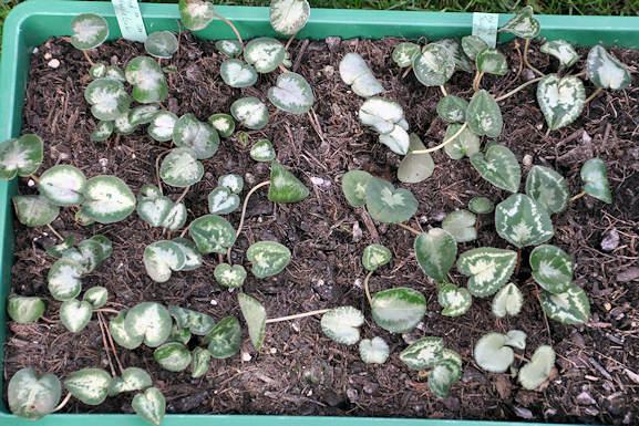 So sehen meine Sämlinge aus. Sie haben das ganze Jahr ihre Blätter behalten, anders als bei meinen "normalen" Cyclamen hederifolium,da tauchen die Blättchen erst jetzt wieder auf.Noch einmal ein Vergleichbild vom Frühjahr.Am 15.Januar Cyclamen hederifolium 'Silver Leaf' (GdS-Samen) ausgesät, haben sie sich gut am nordseitigemFenster bei Raumtemp. entwickelt. Heute sind sie insFrühbeet umgezogen.