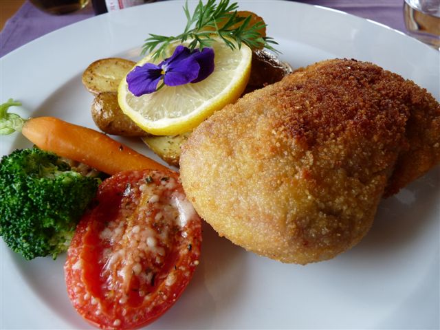 mhh, Kürbissuppe :)ich war auswärts, erst gab es einen Blattsalat und danach Appenzeller-Cordonbleu, Bratkartoffeln unf Gemüse