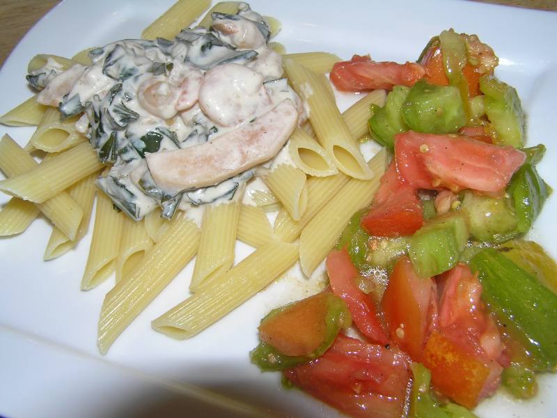 bei uns gabs was gewagtes.penne mit einer soße aus einer besonderen chicoreesorte (..aus dem gartenbeet, sorte cicoria catalogna puntarella a foglia stretta, was immer das auch heißen mag http://www.italienische-samen.de/Cicori ... le%20K.jpg), garnelen und quitte.dazu einen rot-grünen tomatensalat, der nicht wirklich dazu gepasst hat, die tomaten mussten aber weg. tomatensorten: nonna antonia und aunt ruby´s german green.mir hats geschmeckt