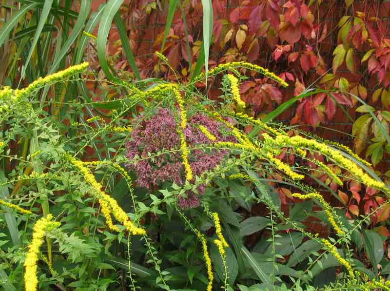 Soldago rugosa gut zwei Wochen später als das Eingangsfoto zu diesem Thread.Die Pflanze werde ich wohl im nächsten Frühjahr zusammen mit einem anderen Miscanthus, Eupatorium und Helianthus 'Lemon Queen' neu kombinieren.