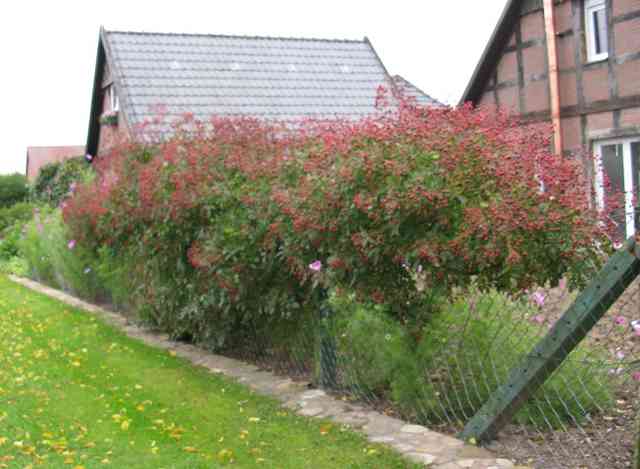 Und Pauls Himalayan Musk lockert die Scheinzypressenhecke mit kleinen, roten "Beeren" auf.