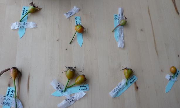 so, der 2. Schwung der diesjährigen Hobbyzüchterhagebutten ist geschnitten. Nicht daß sie sonst noch bei dem Sturm abhanden kommen. die beschrifteten Streifen der Teebeutel sollen mal trocknen, sind mir letztes Mal beim Knoten lösen alle abgerissen, weil sie naß und aufgeweicht waren. Heute nachmittag werden sie dann geöffnet und gesäubert und gesäht. Unser Kind möchte dabei sein unt mithelfen, schließlich ist die Hagebutte ganz links das Ergebnis seines ausdrücklichen Wunsches: Grimpant Brownie Mutterrose, Pollen von Honorine de Brabandt