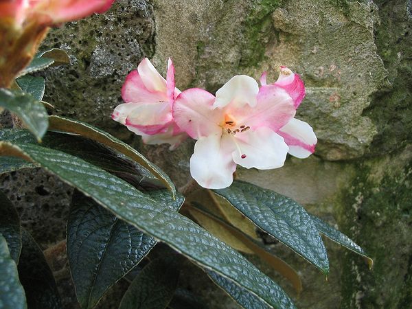 Mensch Hortu, du hast ja eine stattliche Rhodosammlung. Schoen, dass du uns visuell etwas daran Anteil nehmen :)laesst, aber du haettest das Forumstreffen dann ja wirklich besser in den April/Mai zur Rhodobluete legen sollen. Hier noch eine Frage an dich oder auch an die anderen Experten in diesem Thread:Das folgende Bild zeigt einen Rhodo, den ich leider unbeschriftet in einem Garten entdeckt habe und der mir sehr gefallen hat. Kann mir jemand einen Tipp geben, worum es sich dabei handeln koennte? Wunderschoen dieses Weiss mit einem ganz leichten Rosahauch und dazu passend leicht blaeuliche recht stabile und platte Blaetter, die einen ein ganz bisschen an orbiculare erinnern koennten.