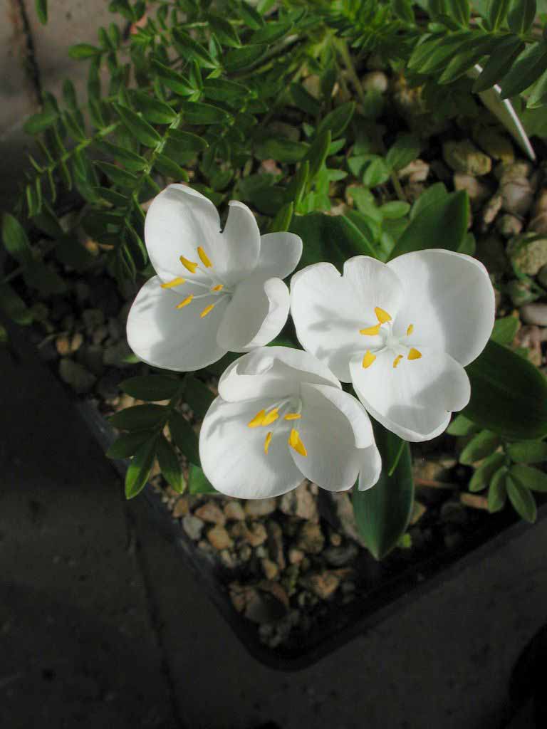 Guten Morgen!Eine der in meinen Augen schönsten Vertreter der Familie Commelinaceae ist die weiße Weldenia candida aus Mexiko, die jetzt wieder mit neuen Blüten startet, welche an die eines weißen Crocus banaticus erinnern. Die Pflanze ist mit ihren 15 cm Höhe sehr kompakt. Sie muß allerdings trocken und frostfrei überwinteret werden, darf aber nach Auskunft der Herkunftsgärtnerei in der Ruhezeit auch nicht völlig ausdorren. Um die Restfeuchte im Substrat zu kontrollieren, steht im Topf als Indikatorpflanze ein Polemonium mit seinen gefiederten und unter Glas immergrünen Blättern.;)Ph.