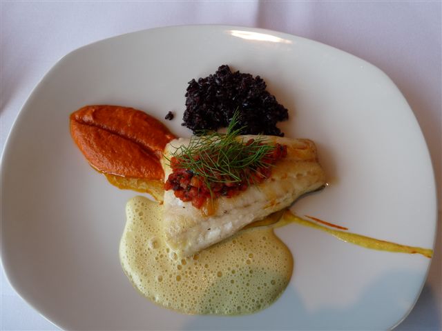 gebratener Zander auf Safranfenchel, Paprikacreme und Riso venere