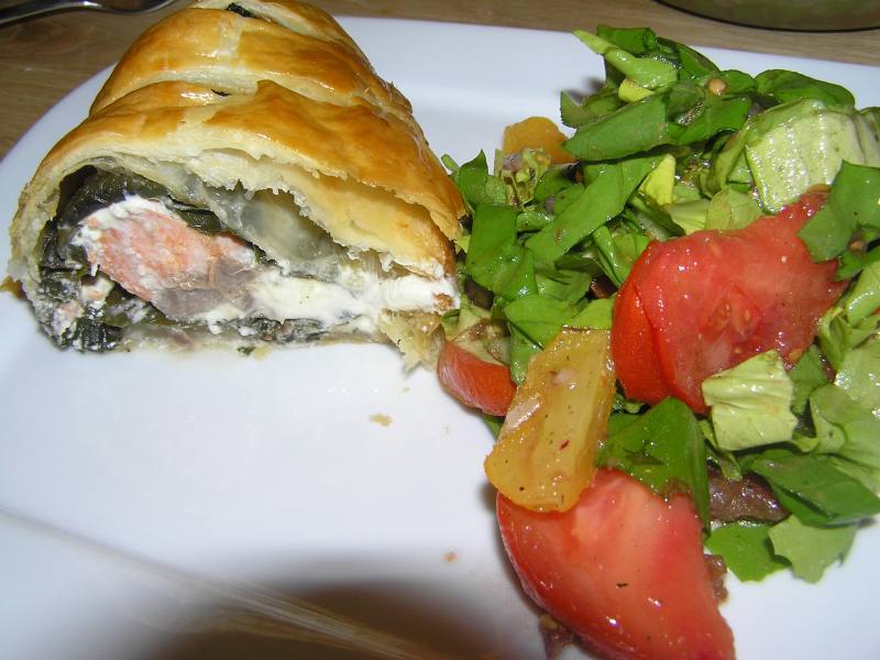 bei uns lachs mit mangold und frischkäse im blätterteig (leider beim aufschneiden ein wenig verrutscht) und salat dazu.