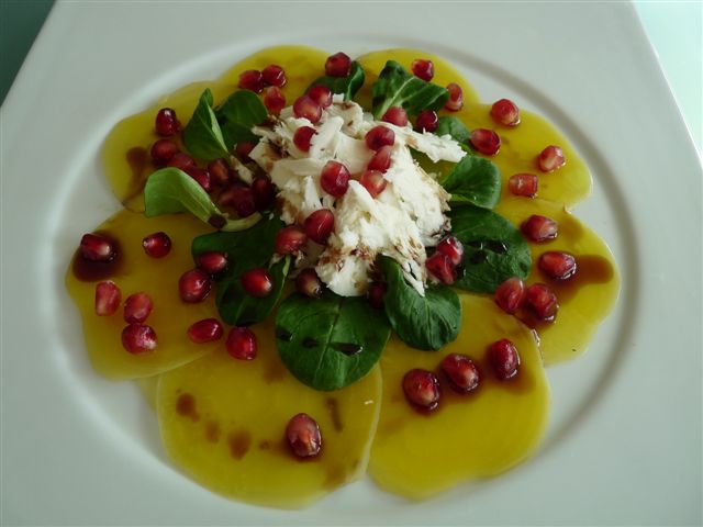 ... diese Kombination finde ich spannendbei mir gab es ein Carpaccio aus gelber Bete, Nüsslisalat, Ziegenkäse, Granatapfel, mit grünem Walnussöl