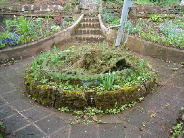 Nun, der Wasserhahn könnte der Entleerung des Beckens dienen (Frostschutz).Dieses Rondel lässt sich doch sehr schön nutzen. Zusammen mit den sichtbaren Elementen empfiehlt sich das Ganze für eine Art "Perterre-Garten" mit von Buchs eingefassten Beeten. Streng symmetrisch oder verspielt. Das Rondell könnte als Wasserspiel verwendet werden. Mit oder ohne Brunnefigur. Die Schwengelpumpe würde ich allerdings entfernen. Das Becken ließe sich umpflanzen mit Buchs (wiederum streng und klassisch) oder durch üppige Farne gemischt mit dazu passenden Stauden.