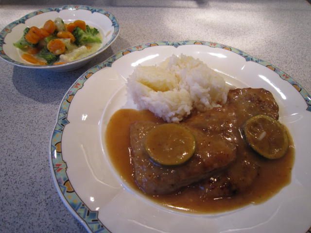 Gestern hatte ich Kollegentreffen und wir waren essen. Dort gab es bei mir Kastanienschaumsuppe mit gebratenem Rehrücken, danach Jakosmuscheln auf Schalotten-Speck-Gemüse ... war prima, Fotos habe ich keine gemacht. Heute gabs dann bei uns Kalbsschnitzelchen mit Limettensauce, Reis und Gemüse.