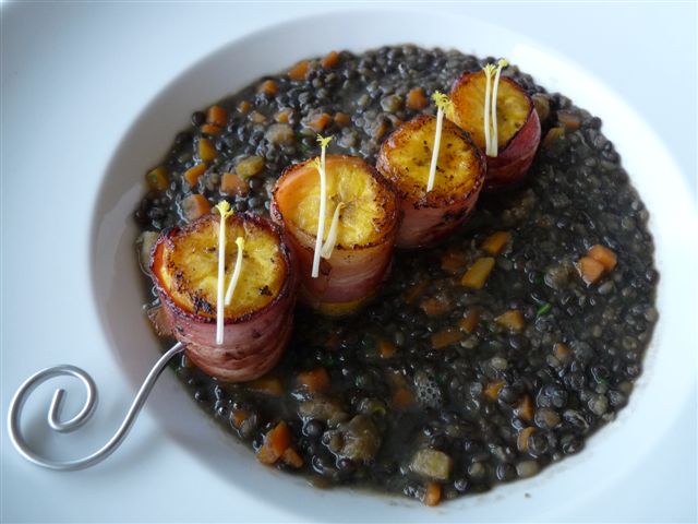 passend zum Wetter: Linsensuppe mit Kochbanane im Speckmantel gebraten