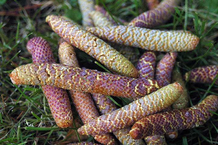 Das sind die männlichen Blüten, nicht die weiblichen Blütenstände, die dann zu Zapfen heranwachsen.Die Dinger fallen beim Trocknen auseinander.