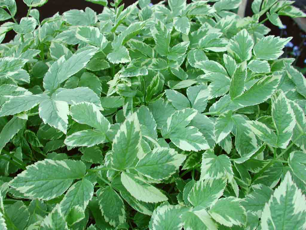 : eine wunderschöne Schattenstaude ist das panaschierte Aegopodium podagria - allerdings nur im Kübel, und blühen darf´s nimmer.