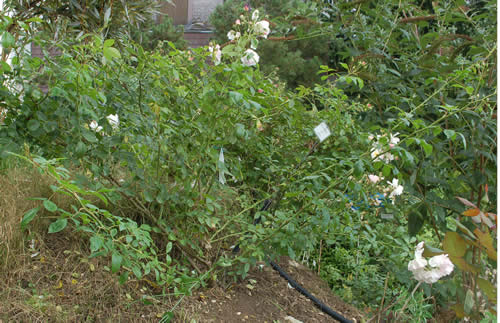 Auf 2,5 m Höhe zeigt sie immer noch sicher ein gutes Dutzend Blüten, schlecht zum Fotografieren, hier von der Terrasse herunter. Das letzte Bild.Souvenir de Malmaison Clg