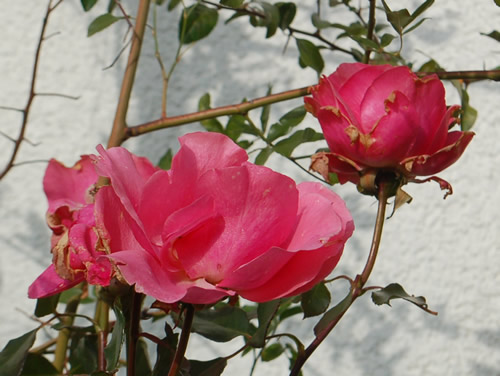 Auf 2,5 m Höhe zeigt sie immer noch sicher ein gutes Dutzend Blüten, schlecht zum Fotografieren, hier von der Terrasse herunter. Das letzte Bild.Souvenir de Malmaison Clg