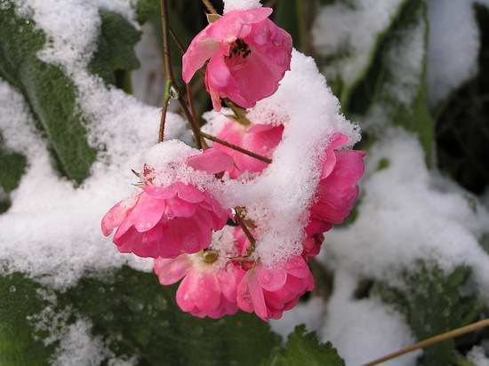 Letzte Blüten im Schnee: mein namenloses Bodendeckerrösle: