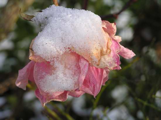 Letzte Blüten im Schnee: mein namenloses Bodendeckerrösle: