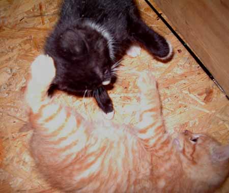 ;)Das Kind und ich würden sie am liebsten (auch noch) behalten, seufz...Aber sie brauchen ja demnächst nicht nur teure Impfungen und Kastrationen (für letzteres sparen wir schon hinsichtlich der März-Kater: Besonders der Graue ist bald "fällig") sondern auch Bezugspersonen...Von den Kindern ist ja nur noch die Jüngste öfter zuhause und zu zweit (der Liebste ist leider tierlos aufgewachsen) ist es schon schwierig, den anderen Katzen ( plus Hunden und Kaninchen) genug Zuwendung zu geben...Von daher sehe ich der Trennung von "Plüschi" und "Ticky" mit einem lachenden und einem weinenden Auge entgegen: Wenn sie zusammen ein wirklich gutes, verantwortungsvolles Zuhause bekommen wird der Trennungsschmerz erträglich...