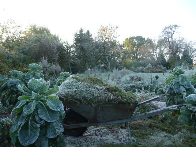 Meine Gemüsebeete bekommen vor dem Winter noch eine dicke Mulchschicht. Das geschnittene Gras war über Nacht in der Schubkarre geblieben, die äusseren Schichten waren an den Metallwänden der Karre festgefroren, in der Mitte war das Gras fast heiss, sehr angenehm für die kalten Hände.