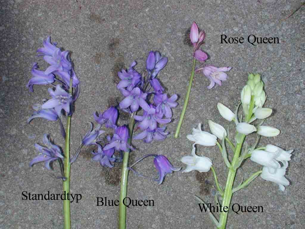 Hierzu ein paar Bilder: Hyacinthoides hispanica Rose Queen ist eine rosa Sorte. Dainty Maid ist eine weitere rosafarbene Sorte aus England, die etwas intensiver in der Farbe ist und einen violetten Blütenstiel besitzt.