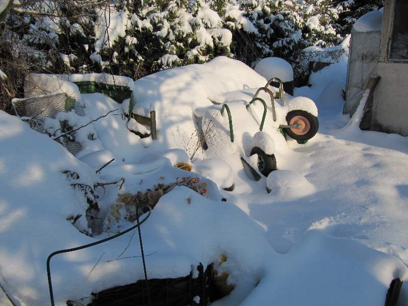 Ähem, ich müsste dafür Schneeschaufeln. So ist halt alles gnädig verdeckt, z.B. die Wannen, in denen noch Topfsubstrat lagert, das ich eigentlich noch für Topfaktionen benutzen wollte, aber dann regnete es und dann wurde es sehr kalt und alles gefror und dann begann es zu schneien....