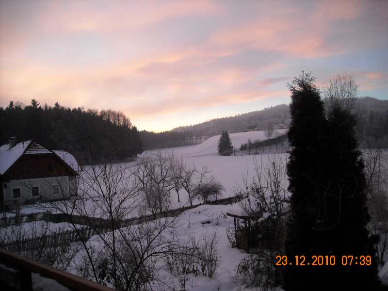 +1°C, auch nachts hat es geregnet. Der Schee auf dem Schuppendach ist auf 30cm zusammengesackt. Aber morgen soll es, pünktlich zum Fest wieder schneien, weiße Weihnacht ist hier gesichert